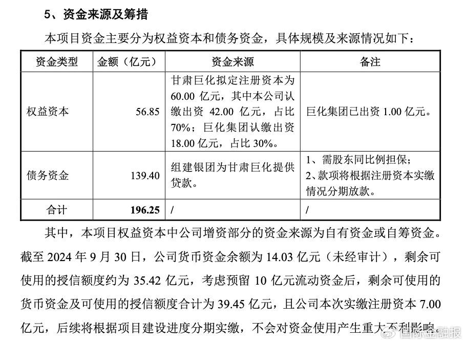 简言之,巨化股份需自行出资42亿元,同时为甘肃巨化提供担保约97.58亿元。截至2024年9月末,巨化股份账面货币资金14.03亿元,资产总计277.71亿元,负债合计94.06亿元。